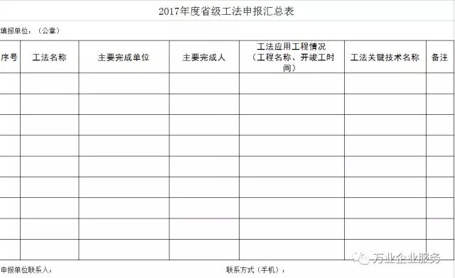 (七)2017年度省級工法申報匯總表,其電子版連同工法文本電子文檔發(fā)至郵箱751713940@qq.com。