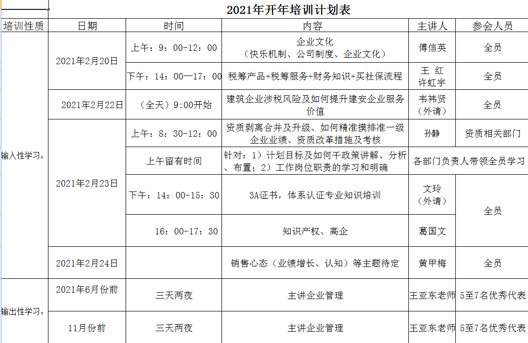 新年伊始,萬(wàn)象更新,鞭炮映日,開工起航!為迎新年新氣象,賦能打好第一槍,2月20日安徽萬(wàn)業(yè)2021年開年培訓(xùn)正式開啟,培訓(xùn)從2月20日9:00起至2月23日18:00,為期三天!開年培訓(xùn)是萬(wàn)業(yè)的傳統(tǒng),全員參加,大家一起汲取知識(shí)和能量,為新一年的戰(zhàn)斗積蓄能量!萬(wàn)業(yè)的家人們?cè)诠炯袑W(xué)習(xí),通過(guò)公司內(nèi)部員工、外請(qǐng)老師、黃總等主持講課,讓大家接受了這場(chǎng)開年培訓(xùn)的潤(rùn)澤。新年伊始,萬(wàn)象更新,鞭炮映日,開工起航!為迎新年新氣象,賦能打好第一槍,2月20日安徽萬(wàn)業(yè)2021年開年培訓(xùn)正式開啟,培訓(xùn)從2月20日9:00起至2月23日18:00,為期三天!
