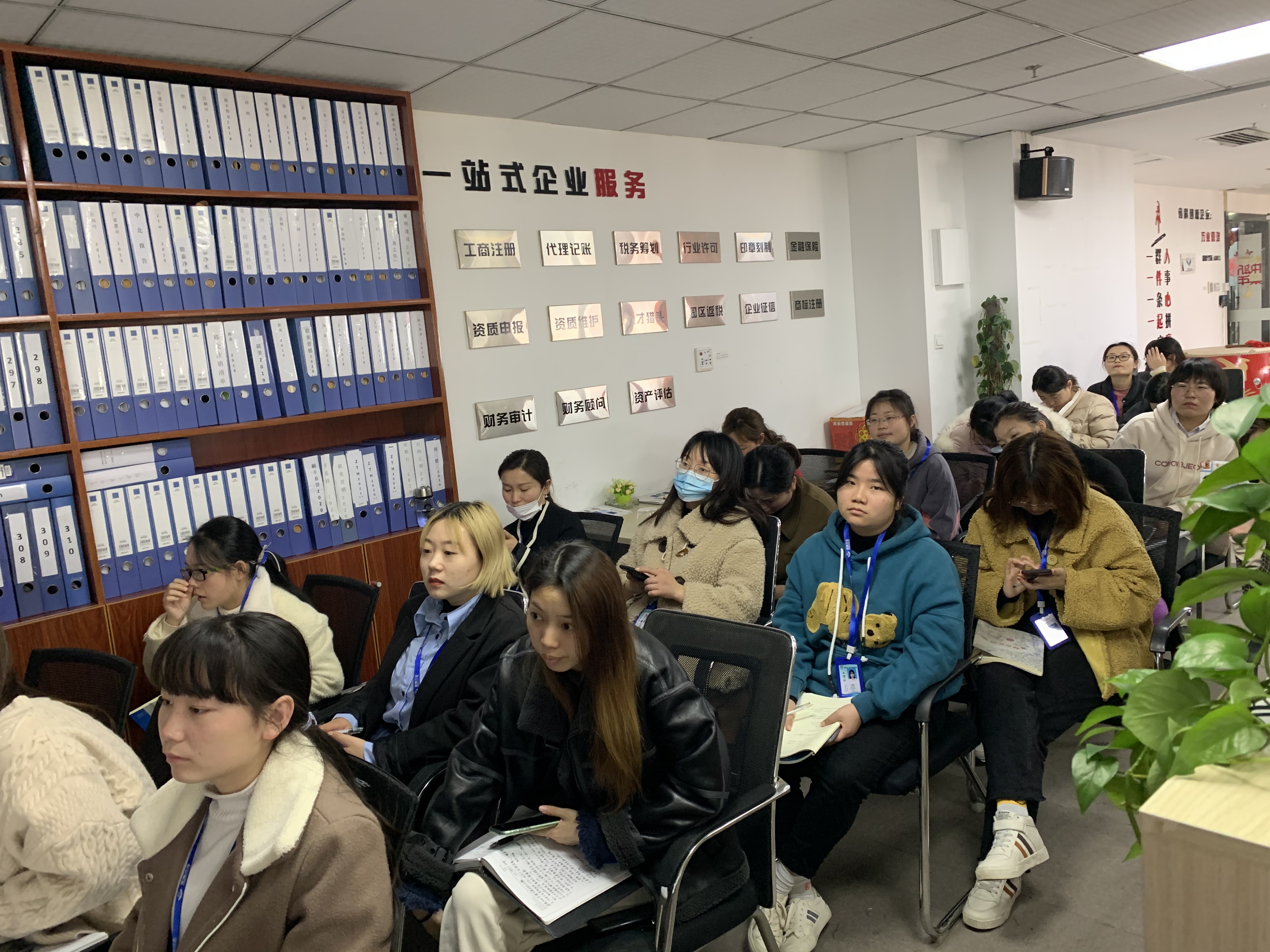 緊接著,下午,安徽萬(wàn)業(yè)中天衡——王所、會(huì)計(jì)部——許主管為大家講解了“稅籌產(chǎn)品、稅籌服務(wù)、財(cái)務(wù)知識(shí)”“購(gòu)買社保流程”,全員積極參與,用心傾聽。