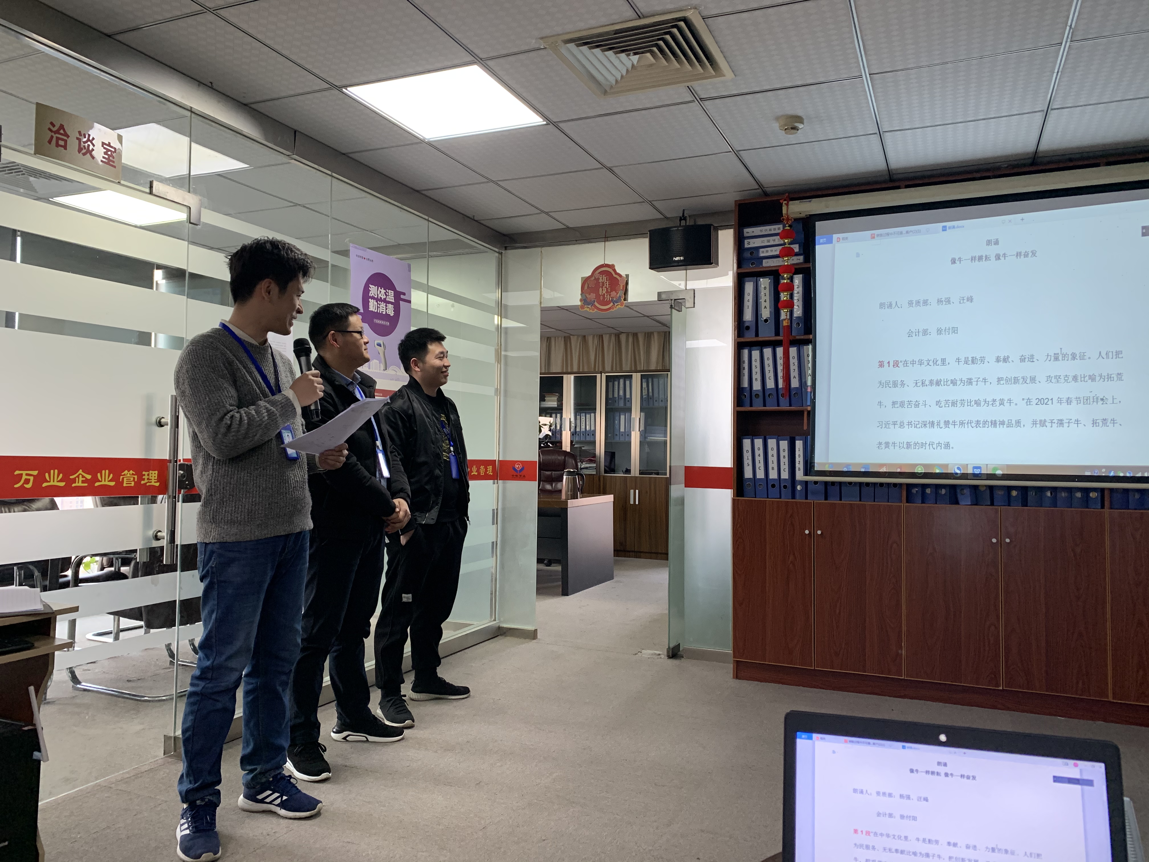 資質(zhì)部——汪峰、楊強(qiáng),會(huì)計(jì)部——徐付陽(yáng)朗誦“像牛一樣耕耘,像牛一樣奮發(fā)”
