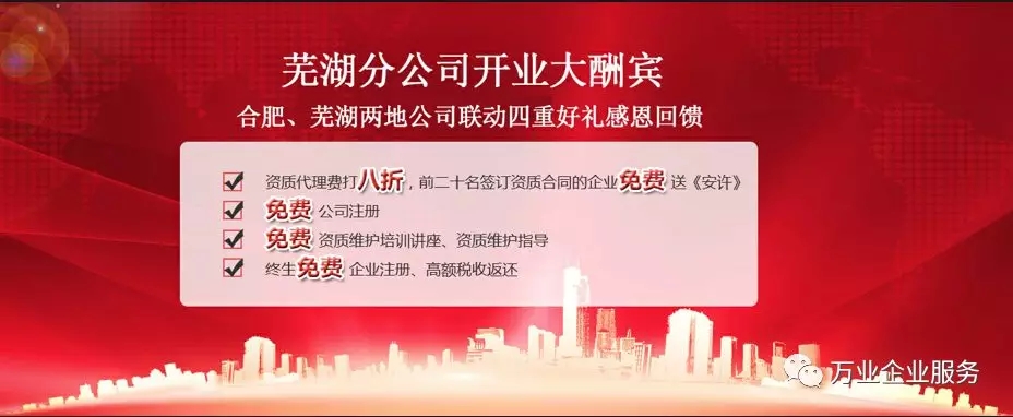 免費(fèi)福利 1 資質(zhì)代理費(fèi)打八折,前二十名簽訂資質(zhì)合同的企業(yè)免費(fèi)送《安許》 2 免費(fèi)公司注冊(cè) 3 免費(fèi)資質(zhì)維護(hù)培訓(xùn)講座、資質(zhì)維護(hù)指導(dǎo) 4 終生免費(fèi)企業(yè)注冊(cè)、高額稅收返還 說(shuō)了這么多,快跟隨小編一睹新公司的風(fēng)采吧! 開(kāi)分公司對(duì)于我們來(lái)說(shuō)是挑戰(zhàn)也是機(jī)遇,挑戰(zhàn)在于外部環(huán)境,機(jī)遇在于面對(duì)挑戰(zhàn)我們?nèi)匀荒軌蚩焖偬幚聿⑶也粩嘧晕覂?yōu)化?,F(xiàn)分公司需要做的就是充分發(fā)揮我們的優(yōu)勢(shì),希望在這座城市里能夠做出更好的成績(jī)來(lái)回饋大家。謝謝大家長(zhǎng)期以來(lái)的支持,安徽萬(wàn)業(yè)才能更好的成長(zhǎng)為大家提供更優(yōu)質(zhì)的服務(wù)!我們相信,蕪湖分公司這艘滿載著希望的巨輪,定能乘風(fēng)破浪到達(dá)成功的彼岸!